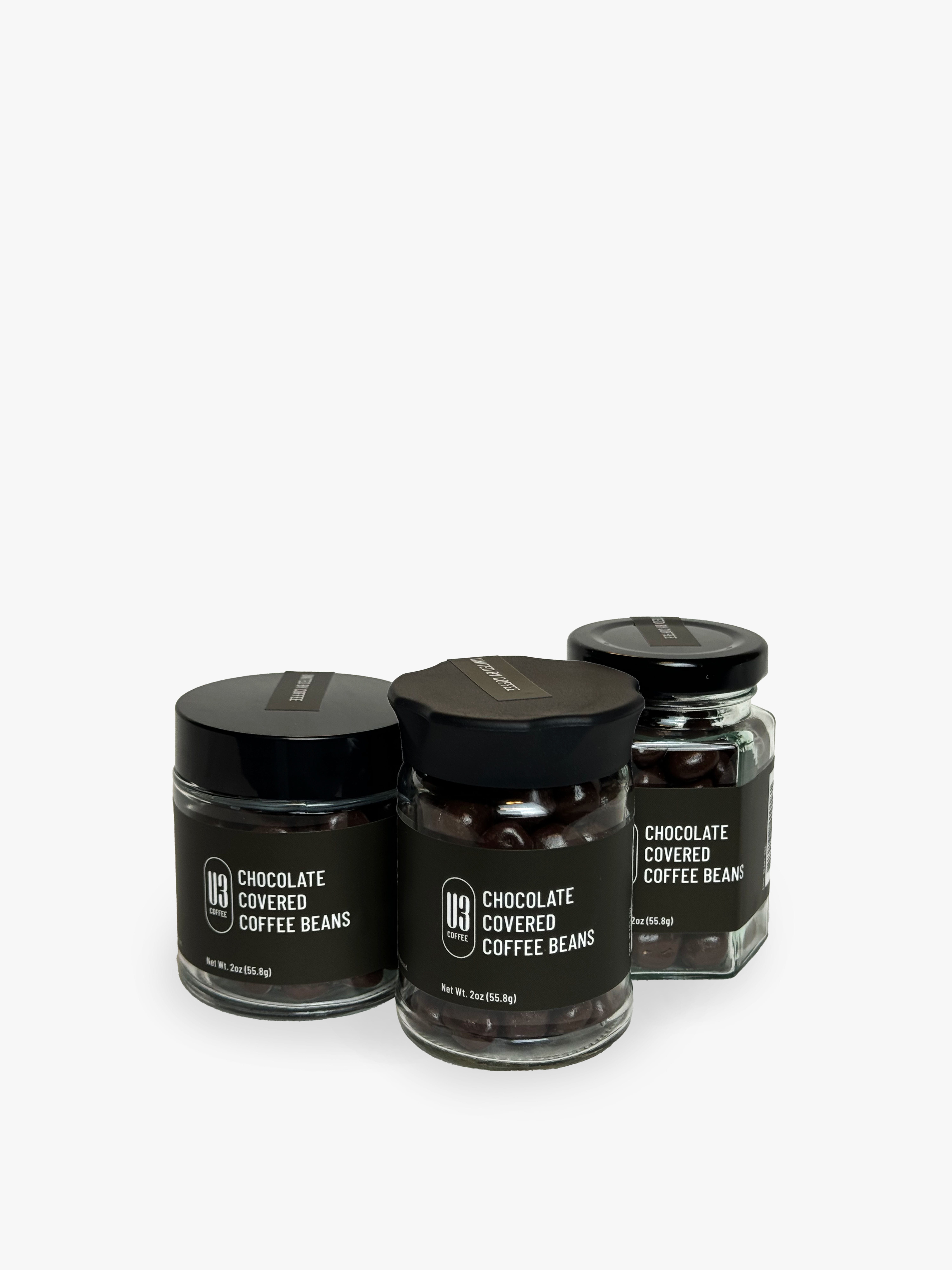 62% Dark Chocolate Medium Roast Coffee Reusable Glass Jar 2 oz net weight of chocolate covered coffee beans